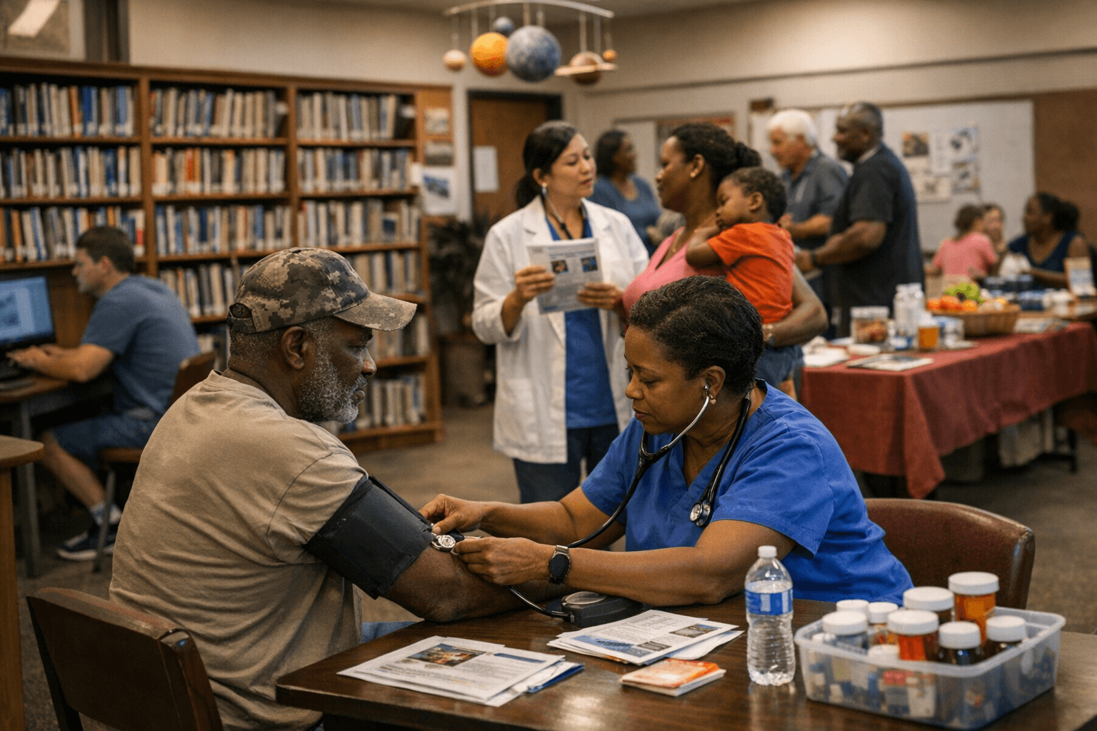 The branch offers traditional library services including book lending, public computers, and basic research assistance, while participating in regional and statewide networks that expand access to materials. Regular children and family programs include storytime, kids STEAM activities, Saturday movies, and special pop up markets that have been linked to literacy campaigns and health education initiatives. Meeting rooms and community space are frequently used by local groups, health outreach providers, and literacy partners to host vaccine clinics, wellness education sessions, registration drives, and other services aimed at vulnerable residents.