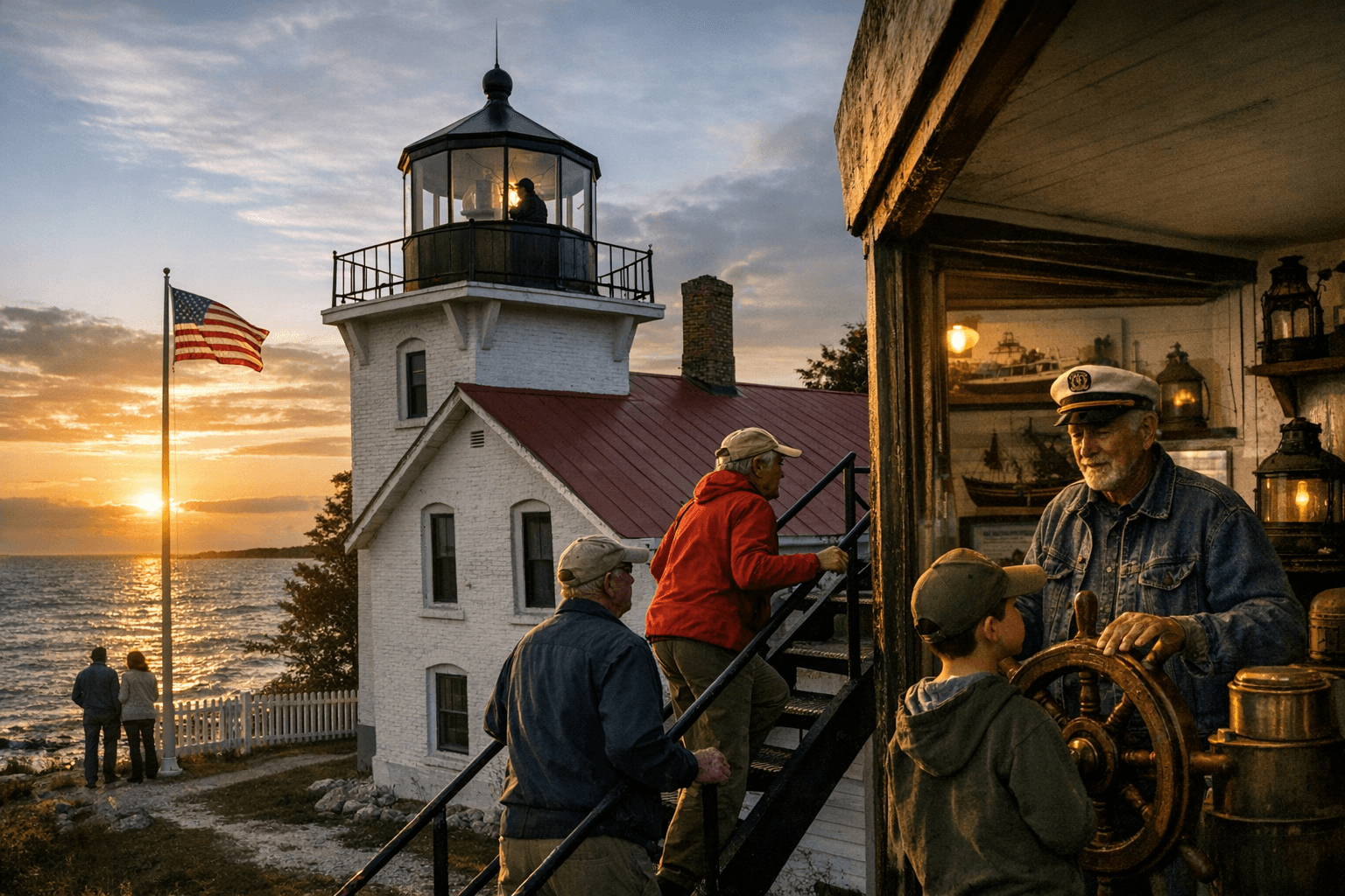 The Grand Traverse Lighthouse, set near Northport at the tip of the Leelanau Peninsula, remains an accessible day trip and a center for local preservation work. The site includes a restored keeper’s dwelling and the 1899 tower; the station’s roots extend to the 19th century and the historic tower was decommissioned as a primary aid when the light was automated in the 1970s. Preservation groups and local volunteers operate the museum and maintain exhibits that document Fresnel-lens-era navigation, fog-signal history, and regional shipping and shoreline stories.