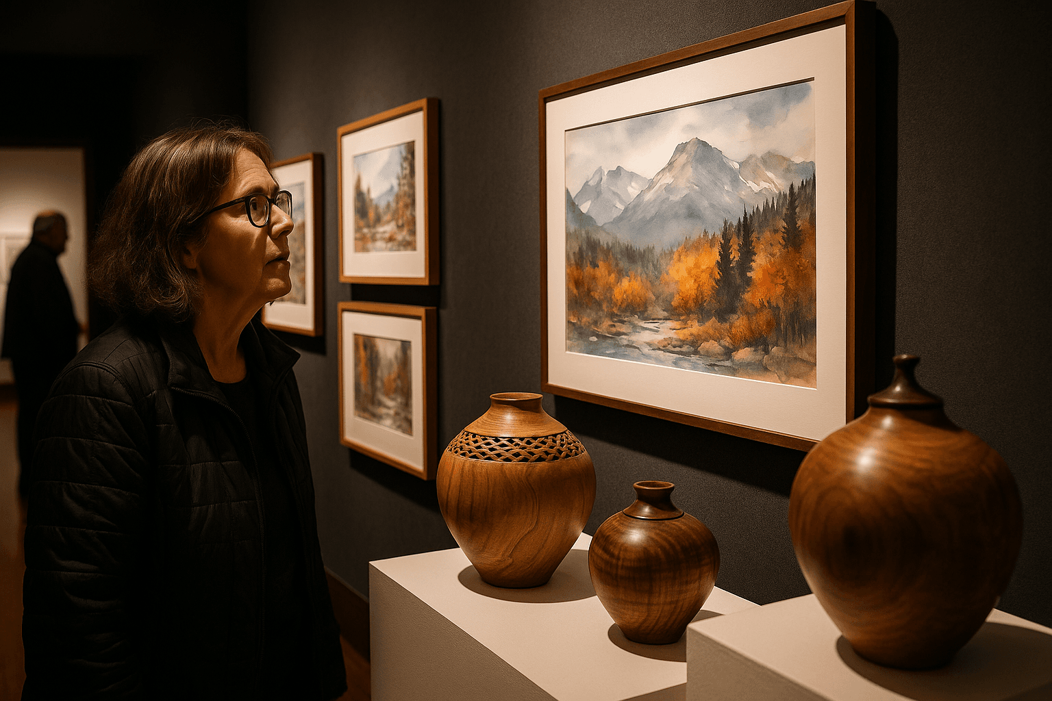 Shadur's watercolor series continues her exploration of national parks as fragile and sacred places, using the medium's translucence to emphasize vulnerability and memory. Mawson's solid wood turnings draw on Midwest species, finished with ink and burning tools to create surfaces that recall woven basket textures while remaining fully turned from single blocks of wood. The visual contrast between delicate washes and tactile, sculptural forms framed the gallery this month.