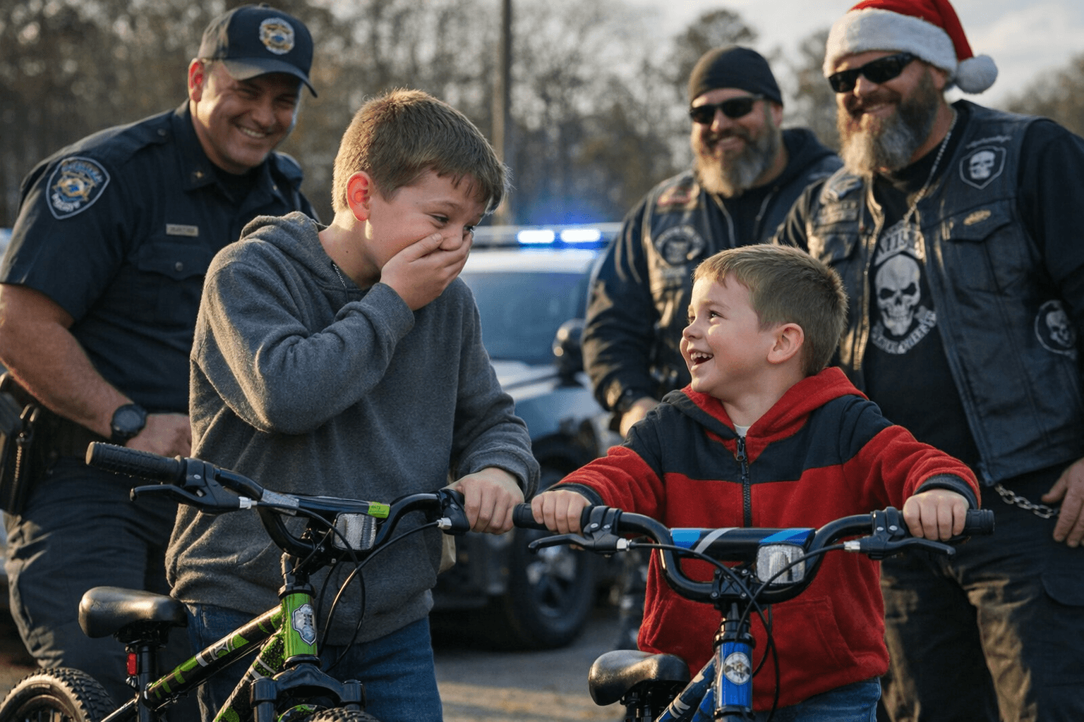 The original scene at Village Green Park set the tone for the later holiday gesture. When officers and members of Punishers LEMC Three Rivers realized the raffle bike was too small for Preston, they told him, “Don’t worry, Preston, we have more bikes. We will get you one that fits.” Preston replied, “No, that’s okay. I want to give it to my little brother.” That selfless decision prompted Chief Johnson to reconnect with the family and arrange the Operation Blue Santa surprise.